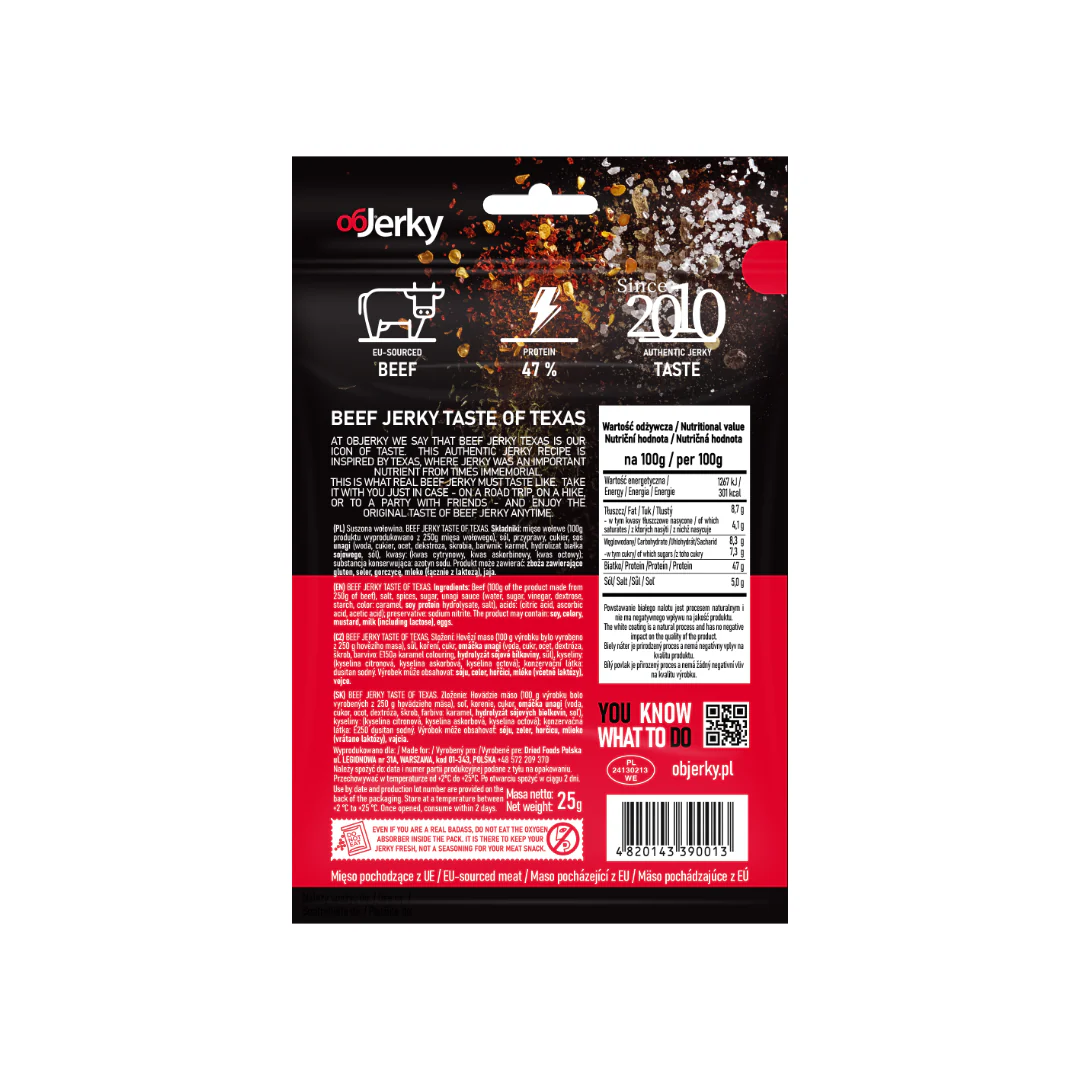 Beef 85%, spices and additives 15% (salt 6%, sugar, soy sauce, spices (chili, paprika, onion, garlic, white pepper, thyme), spice extracts (black pepper, nutmeg, paprika)), preservatives (potassium sorbate, sodium ascorbate), colour stabilizer - sodium nitrite.